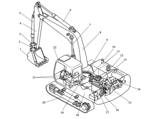 1-鏟斗;2-連桿;3-搖桿;4-斗桿;5-鏟斗油缸;6-斗桿油缸;7-動臂油缸;8-動臂;9-回轉(zhuǎn)支承;10-回轉(zhuǎn)驅(qū)動裝置;11-燃油箱;12-液壓油箱;13-控制閥;14-液壓泵;15-發(fā)動機;16-水箱;17-液壓油冷卻器;18-平臺;19-中央回轉(zhuǎn)接頭;20-行走裝置;21-操作系統(tǒng);22-駕駛室