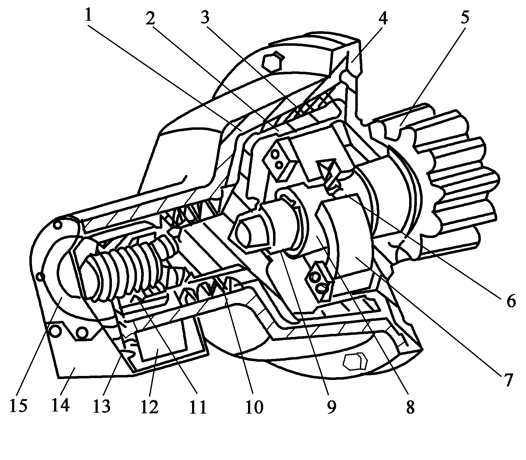 1外殼;2制動錐鼓;3摩擦制動塊;4前端蓋;5齒輪;6拉力彈簧;7離心塊;8中心套架;9旋轉軸;10碟形彈簧;11螺母;12限速保護開關;13限位磁鐵;14安全罩;15尾蓋