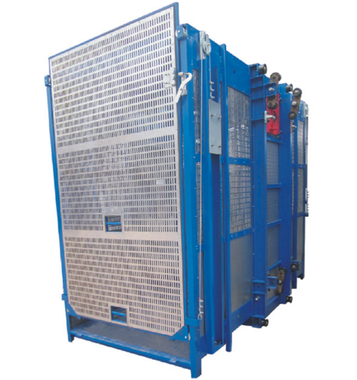 吊籠為型鋼焊接鋼結構件,周圍有鋼絲保護網,有單開或雙開門,吊籠頂有翻板門和護身欄桿,通過配備的專用梯子可作緊急出口和在籠頂部進行安裝、維修、保養和拆卸等工作。吊籠頂部還設有吊桿安裝孔,吊籠內的立柱上有傳動機構和限速器安裝底板。吊籠是升降機的核心部件。吊籠在傳動機構驅動下,通過主槽鋼上安裝的四組導向滾輪,沿導軌運行。