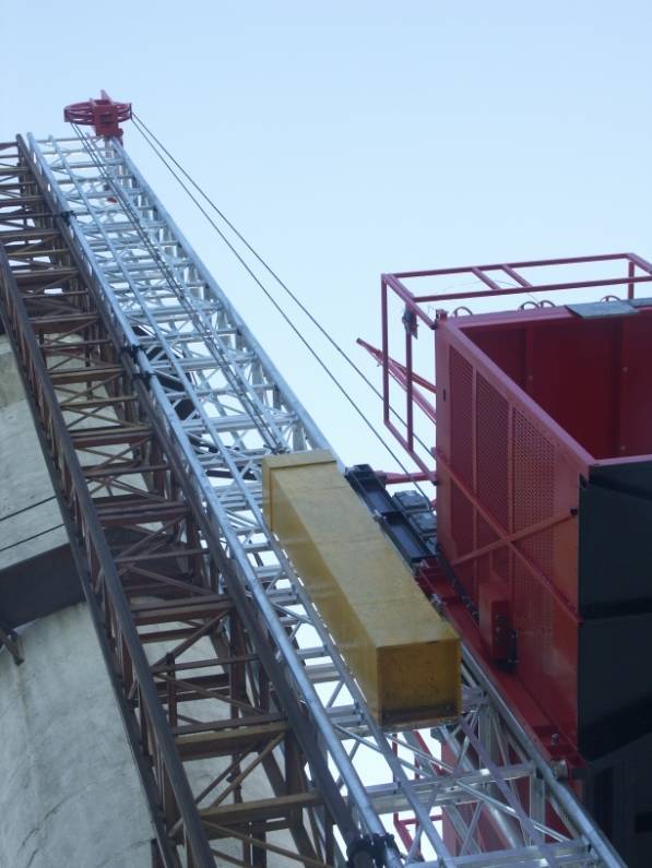 吊桿安裝在籠頂或底籠底盤上,有手動和電動兩種。在安裝和拆卸導軌架時,用來起吊標準節和附墻架等部件。最大起升質量為200kg。
