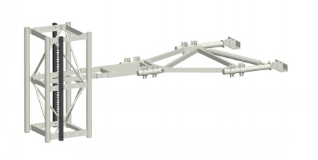 附墻架用來將導軌架與建筑物附著連接,以保證導軌架的穩定性。附著架與導軌架加節增高應同步進行。導軌架高度小于150m,附墻架間隔小于9m。超過150m時,附墻架間隔6m,導軌架架頂的自由高度小于6m。