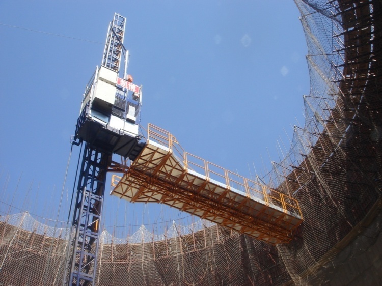 SCD200/200施工升降機,采用籠內雙驅動的齒輪齒條傳動,雙吊籠,在導軌的兩側各裝一個吊籠,有對重。每個吊籠內有各自的驅動裝置,并可獨立地上下移動,從而提高了運送客貨的能力。由于附臂式升降機既可載貨,又可載人,因而,設置了多級安全裝置。每個吊籠額定載重2000kg,最大起升速度35~40m/min,最大架設高度200m。