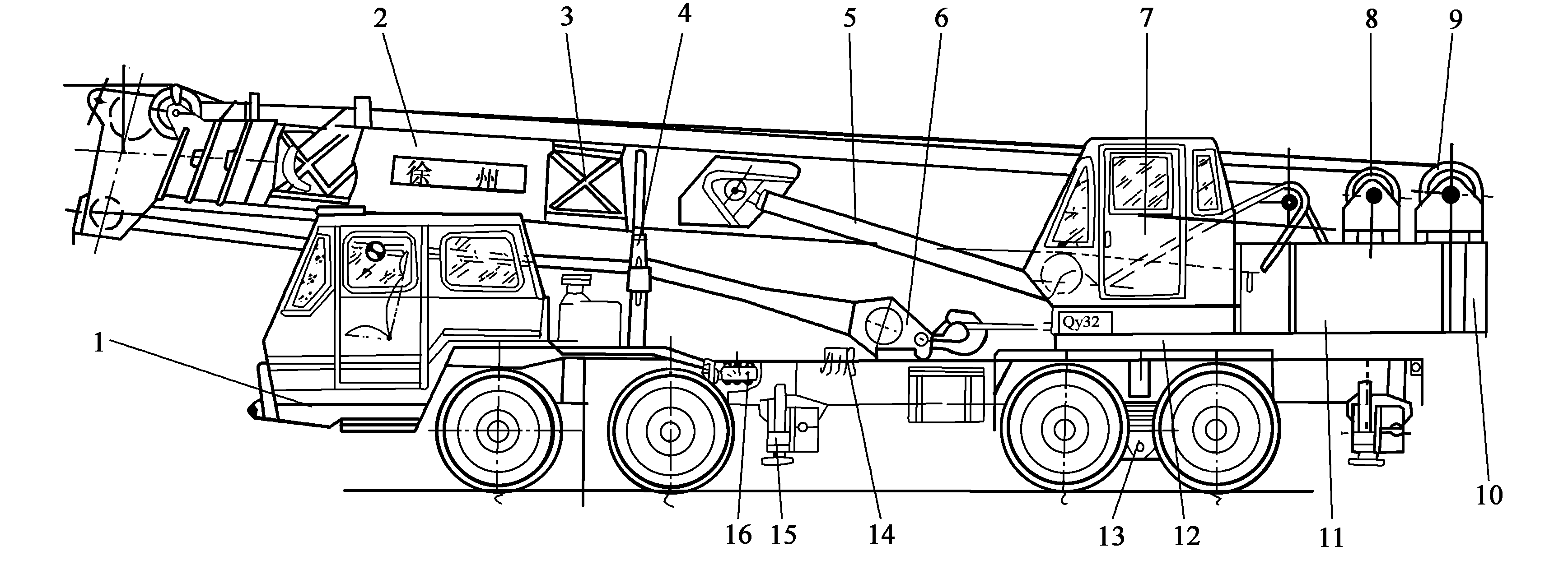 1汽車底盤;2主吊臂;3副臂;4吊臂支架;5變幅油缸;6主吊鉤;7駕駛室;8副卷揚機;9主卷揚機;10配重;