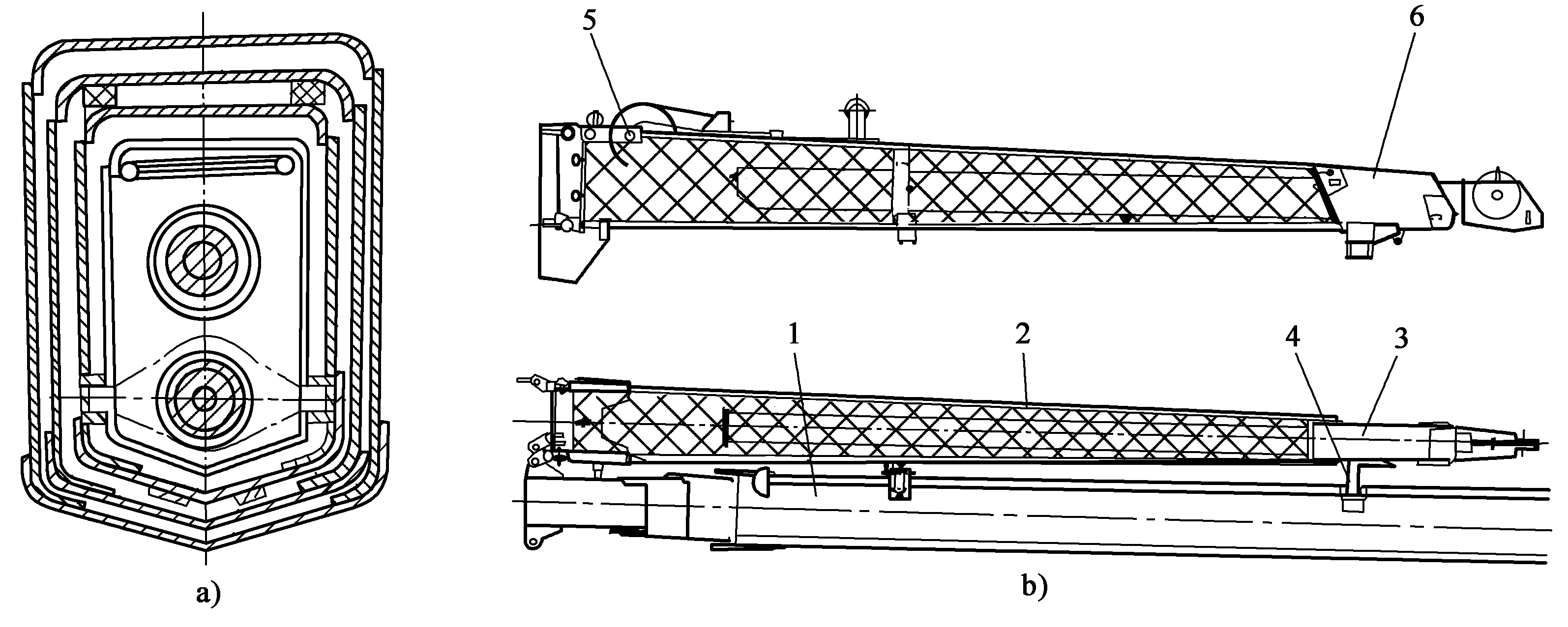副臂架采用高強結構鋼制成。第一節副起重臂為桁架式結構,第二節副起重臂為箱形結構。第二節副臂套裝在第一節副臂內,靠托滾支承。工作時靠人工將二節副臂拉出,然后用銷軸6固定。通過調節軸銷5的位置,可實現5°、30°兩種副起重臂補償角的起重作業。整個副臂采用側置式,收存時置于主起重臂的側方,通過固定銷軸和拖架與主起重臂相連。(圖3-30