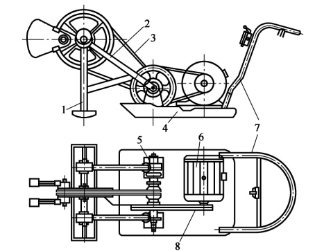 1-夯頭;2-夯架;3、8-三角帶;4-底盤;5-傳動(dòng)軸架;6-電動(dòng)機(jī); 7-扶手