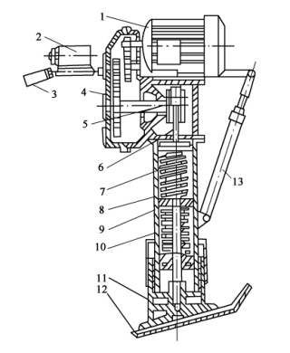 1-電動(dòng)機(jī);2-電氣開關(guān);3-操縱手柄;4-減速器;5-曲柄;6連桿;7-內(nèi)套筒;8-機(jī)體;9-滑套活塞;10-螺旋彈簧組;11底座;12-夯板;13-減振器支承器