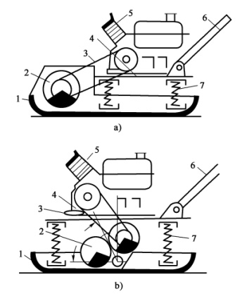 振動(dòng)平板夯分非定向和定向兩種形式,它是由發(fā)動(dòng)機(jī)、夯板、激振器、彈簧懸掛系統(tǒng)等組成,如圖10-21所示。動(dòng)力由發(fā)動(dòng)機(jī)經(jīng)皮帶傳給偏心塊式激振器,由激振器產(chǎn)生的偏心力矩帶動(dòng)夯板以一定的振幅和激振力振實(shí)被壓材料。非定向振動(dòng)平板夯是靠激振器產(chǎn)生的水平分力自動(dòng)前移,定向振動(dòng)平板夯是靠?jī)蓚(gè)激振器殼體中心 (兩激振器中心 )所處位置的不同,使振動(dòng)平板原地垂直振動(dòng)或在總離心力的水平分力作用下水平移動(dòng)。