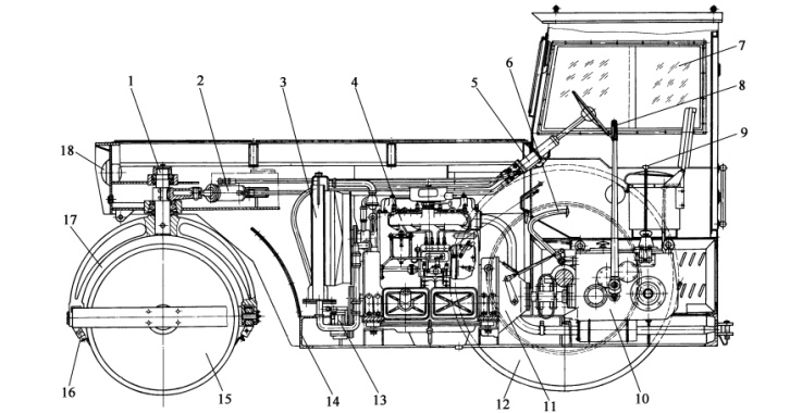 1-轉(zhuǎn)向立軸;2-轉(zhuǎn)向油缸;3-水箱;4-發(fā)動(dòng)機(jī);5-操作系統(tǒng);6-離合器踏板;7-駕駛室;8-換向操縱手柄;9-變速操縱桿;10-傳動(dòng)箱;11-離合器總成;12-驅(qū)動(dòng)輪;13-液壓油泵;14-機(jī)架;15-方向輪;16-刮泥板;17-“形架;18-電氣系統(tǒng)