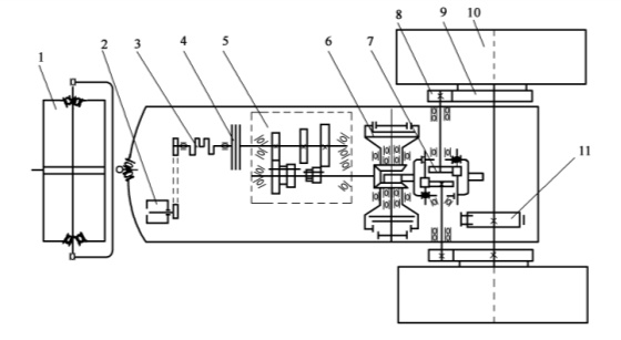 1-導(dǎo)向輪;2-電動(dòng)機(jī);3-發(fā)動(dòng)機(jī);4-主離合器;5-變速器;6-換向機(jī)構(gòu);7-差速器;8-側(cè)傳動(dòng)小齒輪;9-側(cè)傳動(dòng)大齒輪;10-驅(qū)動(dòng)輪;11-差速鎖