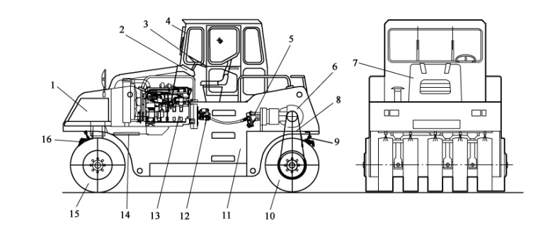 YL26輪胎壓路機(jī)由車架11、發(fā)動(dòng)機(jī)13、減速器6、后驅(qū)動(dòng)橋7、前輪總成15、后輪總成10、灑水系統(tǒng)9、操作系統(tǒng)3、轉(zhuǎn)向系統(tǒng)14、液壓系統(tǒng) 56、電氣系統(tǒng) 18等組成。