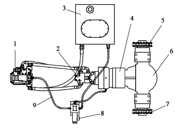 1-液壓泵;2-液壓馬達(dá);3-液壓油箱;4-行走減速器;5-右鏈輪組;6-后驅(qū)動(dòng)橋;7-左鏈輪組;8-制動(dòng)閥;9-油管