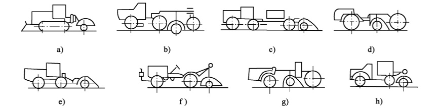 a)履帶式 ;b)輪胎式 ;c)輪履結合式 ;d)自行式 ;e)半拖式 ;f)懸掛式 ;g)中置式 ;h)后置式
