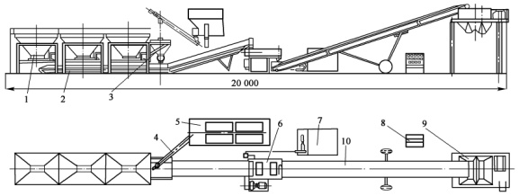 1-配料機 ;2-集料機 ;3-粉料配料機 ;4-螺旋輸送機 ;5-臥式存倉 ;6-攪拌機 ;7-供水系統 ;8-電氣控制柜 ;9-混合料儲倉 ;10­上料皮帶機