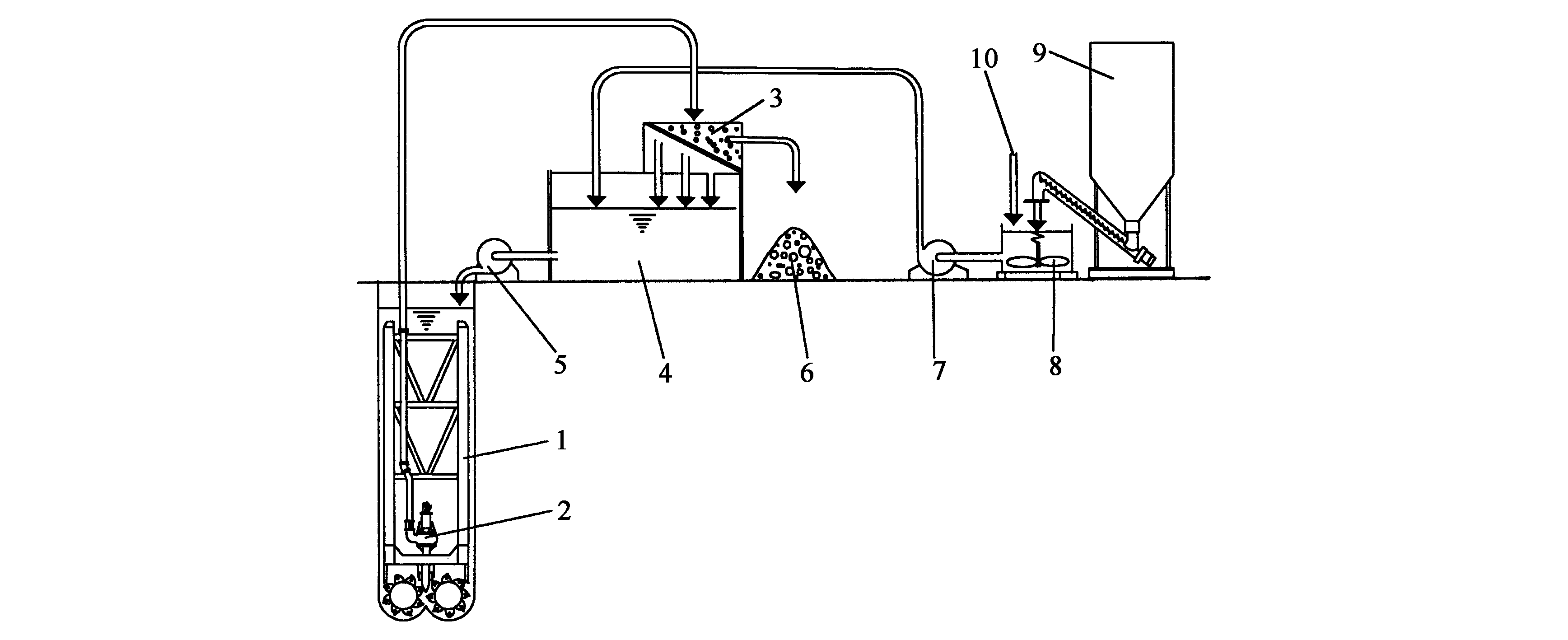 1雙輪銑槽機;2離心吸料泵;3泥漿沙石分離機;4泥漿池;5離心泵;6土;
