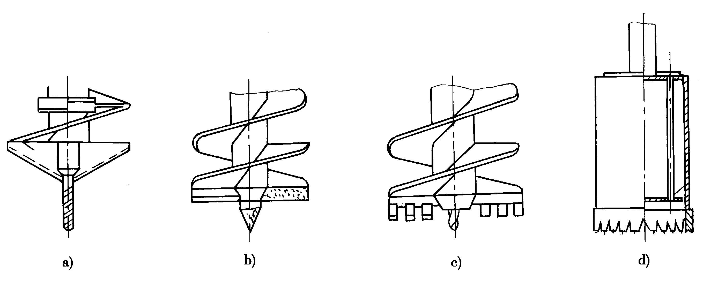 圖a)為雙翼尖底鉆頭是最常用的一種,在翼邊上焊有硬質(zhì)合金刀片,可用來鉆硬黏土或凍土。圖b)為平底鉆頭,適用于松散土層。在雙螺旋切削刃帶上有耙齒式切削片,耙齒上焊有硬質(zhì)合金刀片。圖c)為耙齒鉆頭,適用于有磚塊瓦塊的雜填土層。圖d)為筒式鉆頭,適用于鉆混凝土塊、條石等障礙物。每次鉆取厚度小于筒身高度,鉆進(jìn)時應(yīng)加水冷卻,這種鉆頭有些類似取巖心的勘探鉆頭。