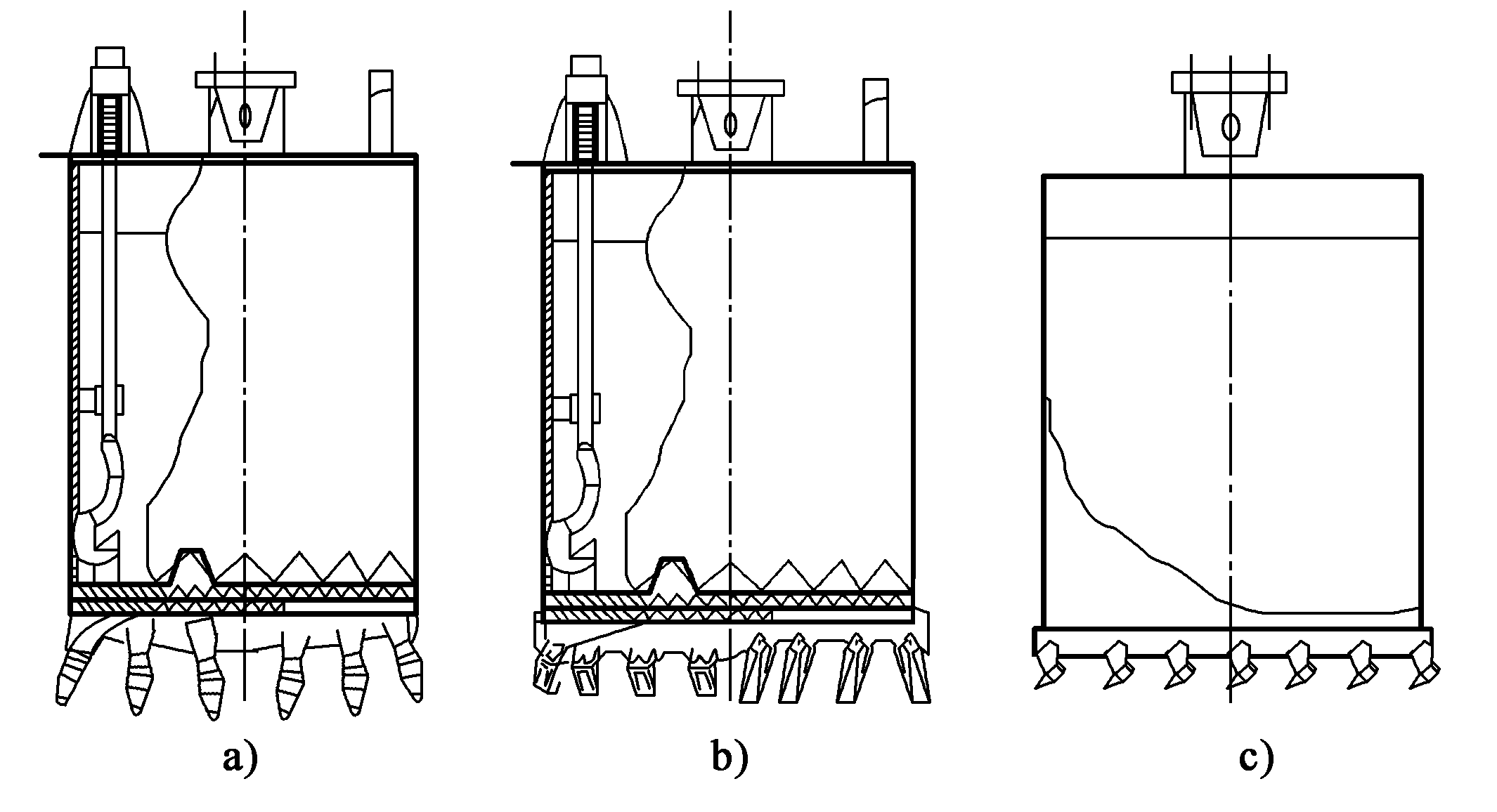 回轉(zhuǎn)斗成孔機(jī)可根據(jù)土壤的不同選擇回轉(zhuǎn)鉆頭,如圖2-35圖中,a)適合鉆硬土;圖b)適合鉆軟土;圖c)不帶斗底,適合鉆巖石。