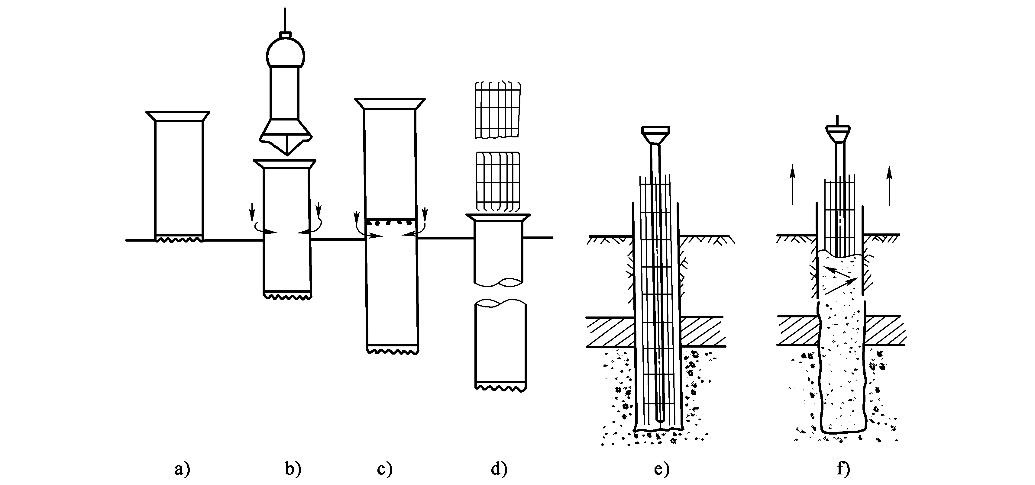 a)插入套管;b)開始挖掘、晃動和加壓套管;c)連接套管;d)插入鋼筋籠;e)插入導(dǎo)管、灌注混凝土;f)灌注的同時拔出套管與導(dǎo)管,直到灌注完成沖抓斗成孔機(jī)工作時噪聲、振動均較小,適應(yīng)的地層范圍廣。由于采用套管,可在軟地基上施工,孔口不易坍方。樁徑能從0.6~2.5m范圍內(nèi)選擇,樁深最大可達(dá)50m,樁的承載能力較高,但成孔速度也較慢。