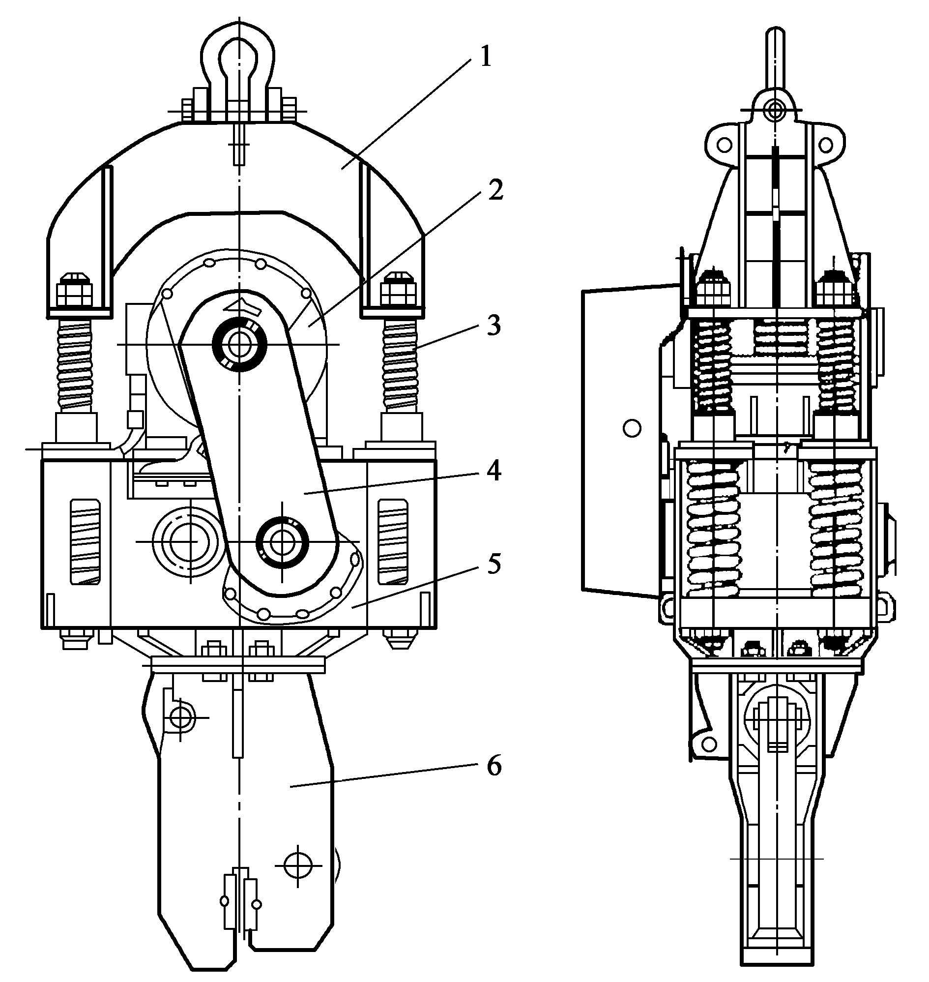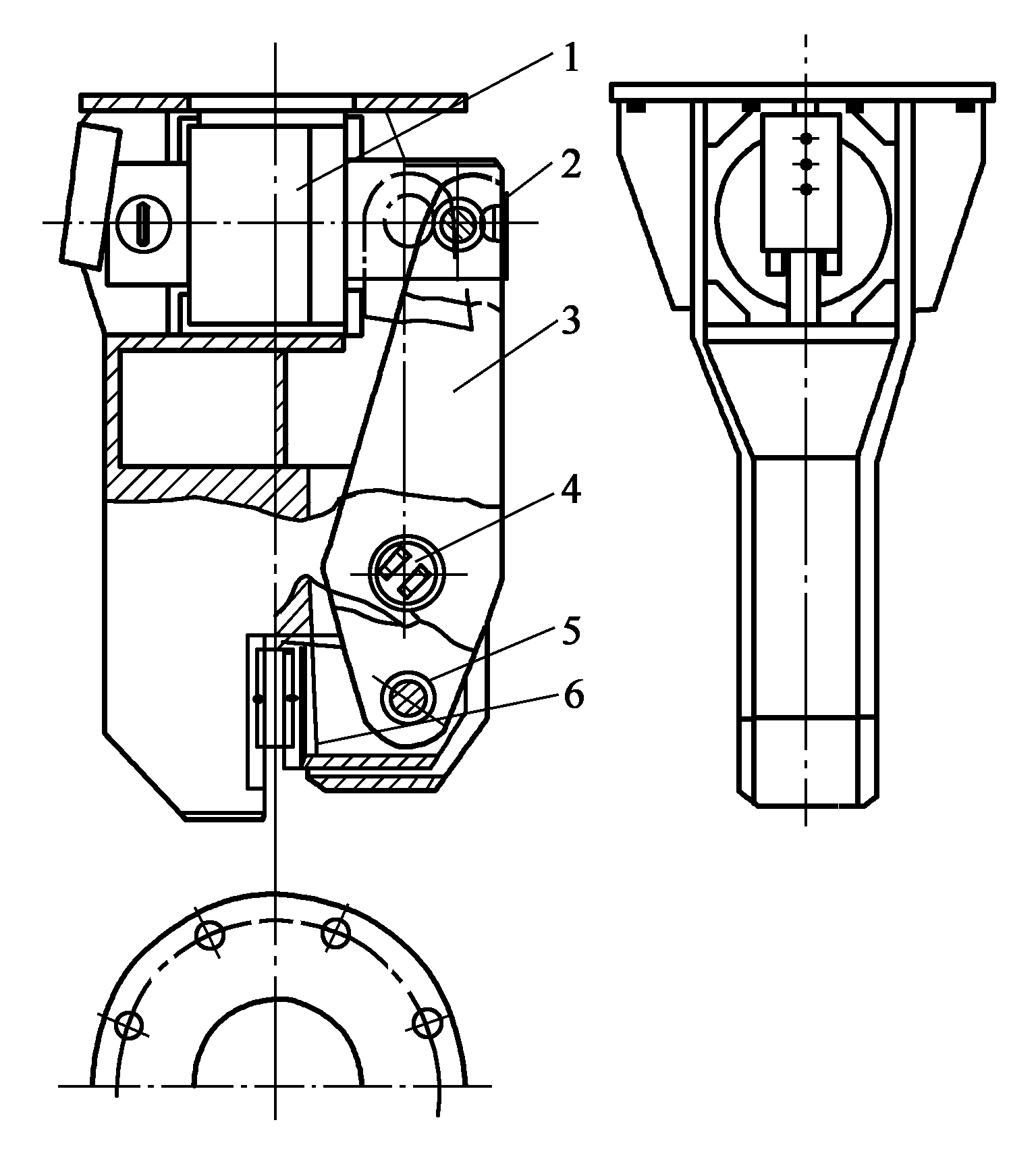 1液壓缸;2液壓缸銷軸;3杠桿;4杠桿銷軸;5滑塊銷軸;6滑動(dòng)塊