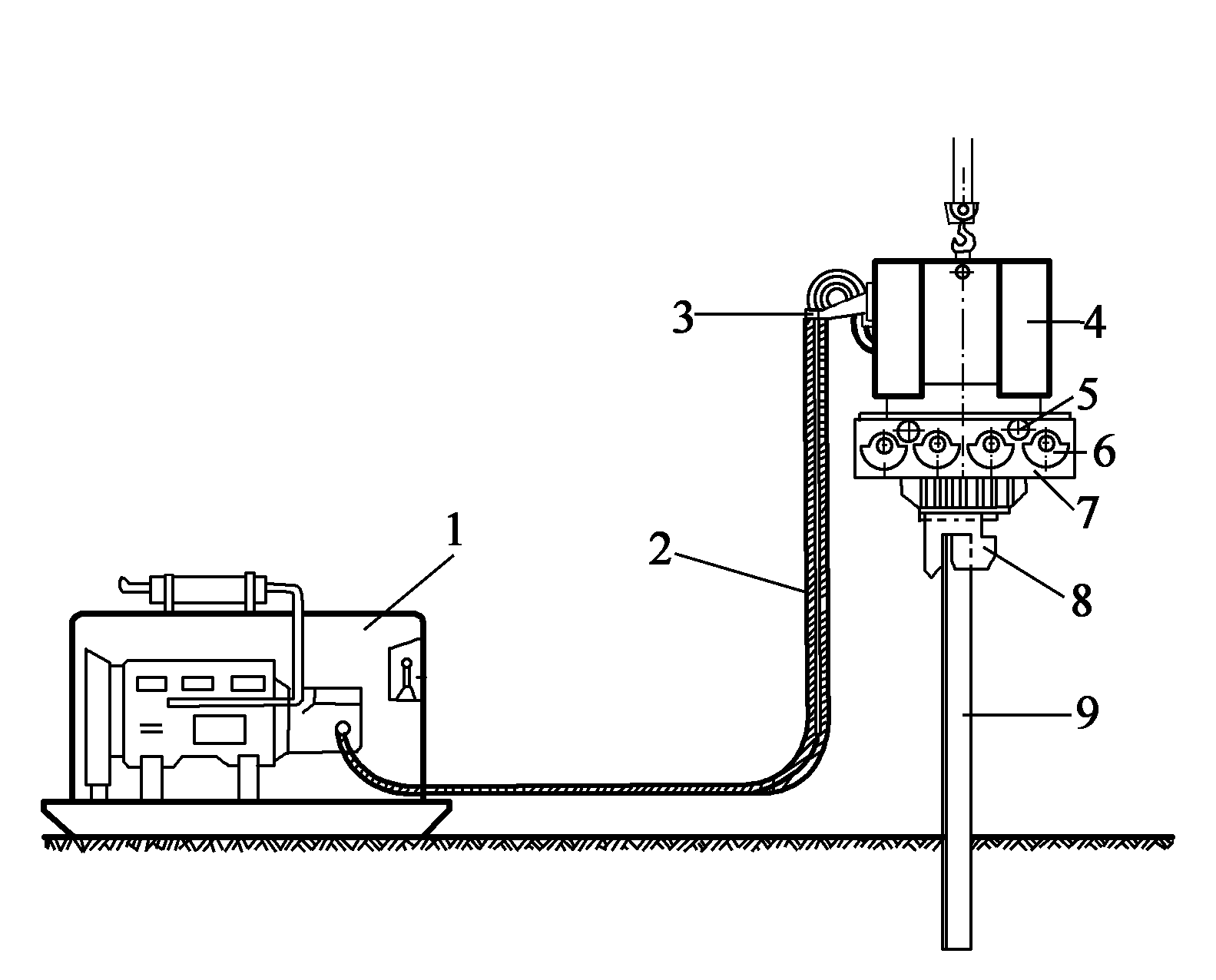 1 動(dòng)力裝置;2 液壓軟管;3 軟管彈性懸掛裝置;4 隔振器;5 液壓馬達(dá);6 偏心塊;7 振動(dòng)箱;8 液壓夾頭;9 樁