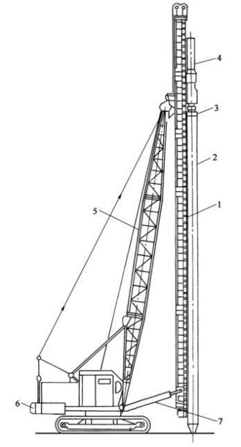 1-樁架立柱;2-3-樁帽;4-樁錘;5-起重臂;6-機體; 7-支撐桿