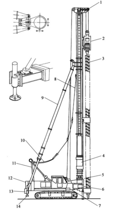 1-頂部滑輪;2-鉆機動力頭;3-長螺旋鉆桿;4-柴油錘;前導(dǎo)向滑輪;6-前支腿;7-托架;8-樁架立柱;9-斜撐;10­導(dǎo)向架起升鋼絲繩;11-三角架;12-主機;13-后橫梁;14­后支腿