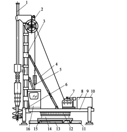 1-鉆機部分;2-電纜卷筒;3-樁架立柱;4-斜撐;5-起架液壓缸;6-前支腿;7-卷揚機;8-液壓系統(tǒng);9-平臺;10-后支腿;11-步履靴; 12-回轉(zhuǎn)機構(gòu);13-行走液壓缸;14-底座;15-行走臺車;16-操作室