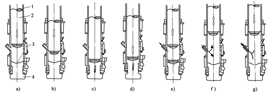 a)噴油;b)壓縮;c)沖擊、霧化;d)燃爆;e)排氣;f)吸氣;g)降落