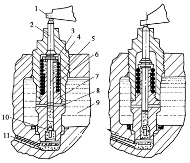 1-曲臂;2-頂桿;3-彈簧座;4-彈簧套;5-柱塞;6-柱塞彈簧7-泵體;8-吸油口;9-燃油箱;10-單向閥;11-出油道