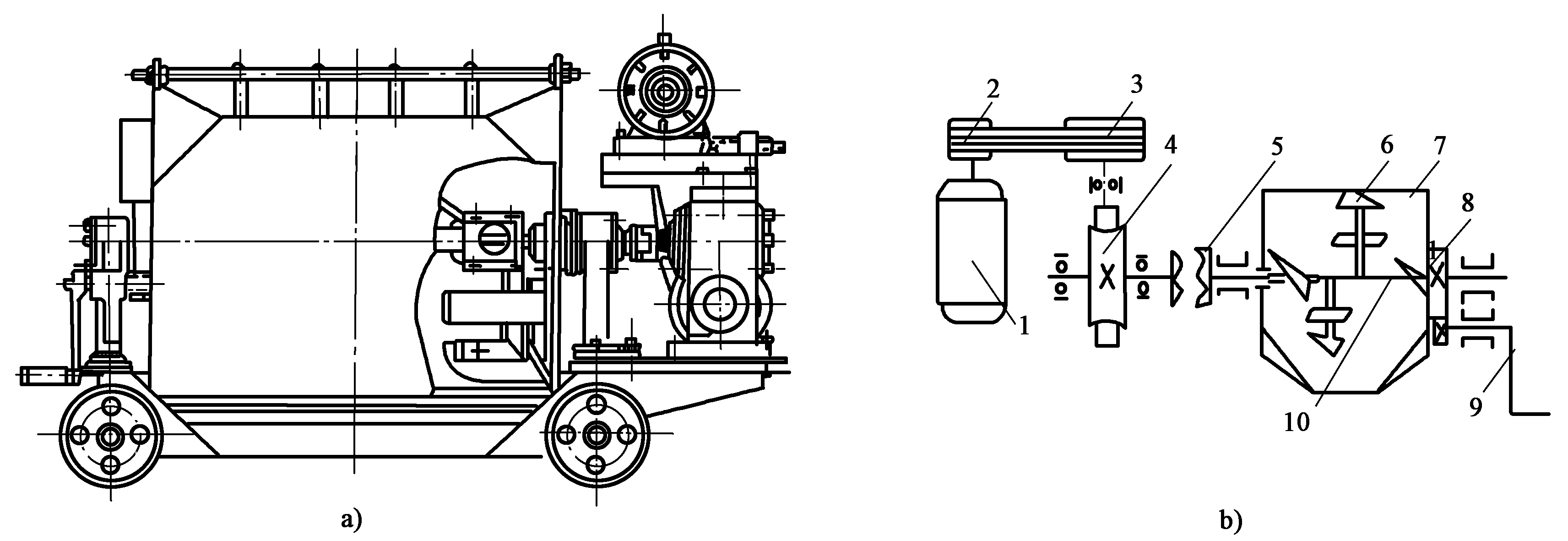 氣動式灰漿泵利用壓縮空氣壓送灰漿。它的主體是一個臥式壓力缸1,頂部裝有壓蓋3。缸內裝有一根帶攪拌葉片的水平攪拌軸6,由電動機或柴油機經減速器驅動。這種泵通常配有空壓機、液壓加料斗、拉鏟、行走裝置等。灰漿可由自身的攪拌裝置制備,也可將制備好的灰漿直接裝入缸內,然后將蓋壓緊,接通壓縮空氣將其送入密閉的壓力缸內,使用時打開出料口,即可將灰漿壓出。該機用途廣泛,除了用作灰漿輸送泵和灰漿攪拌機外,還可以用來攪拌和輸送細石混凝土或干料。(圖6-6