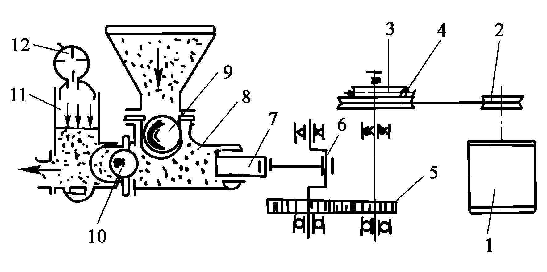 氣罐;2料斗;3電動機;4減速器;5曲柄連桿機構;6三通閥;7輸出口
