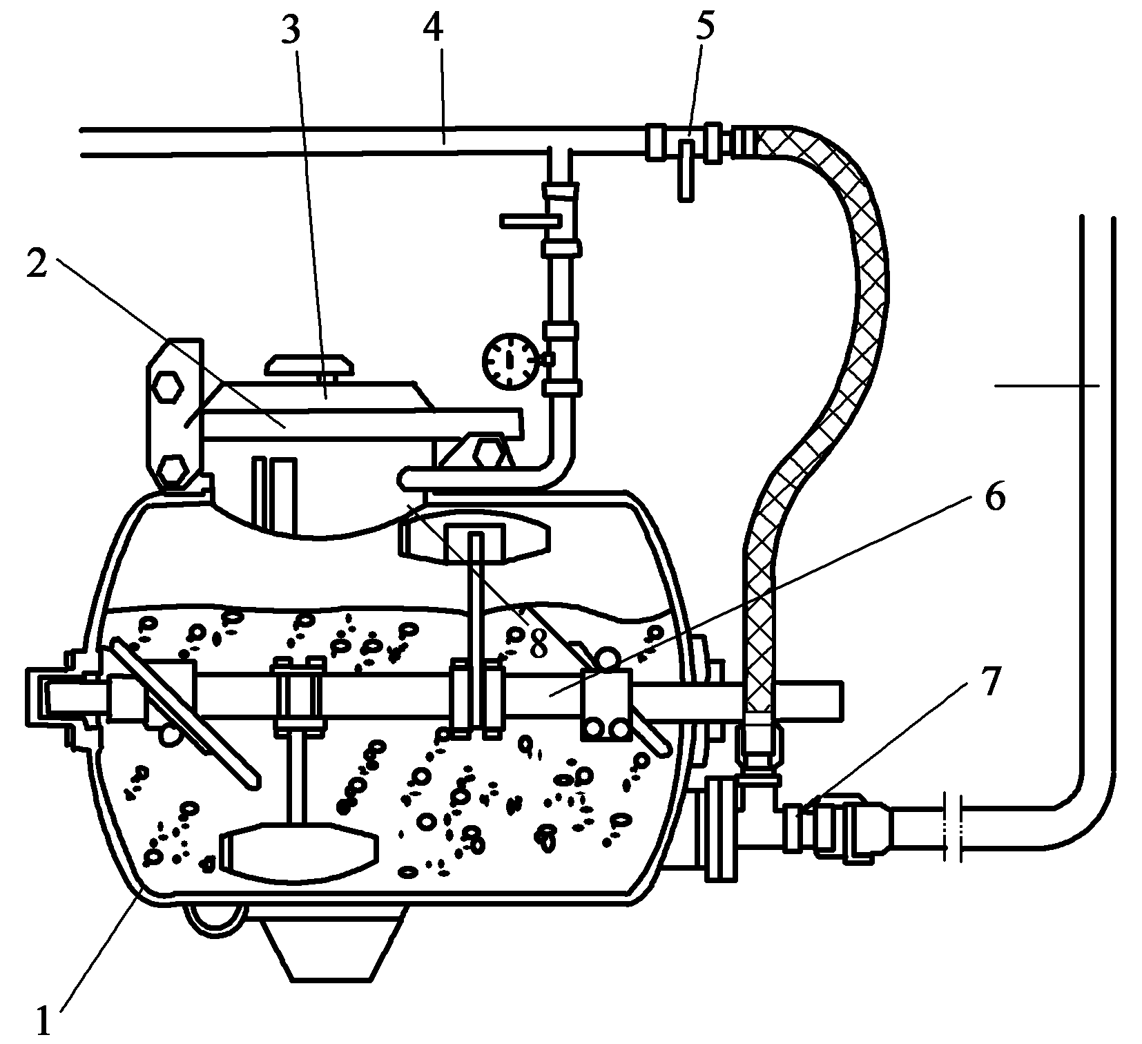 .壓力缸;2.進料口;3.壓蓋;4.壓縮空氣管道;5.開關;6.攪拌軸;7.出料口;8.輸出管道