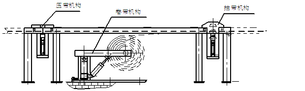 2、 啟動(dòng)拉緊機(jī)構(gòu)進(jìn)行松繩,拉緊小車同時(shí)送開皮帶。開啟抽帶機(jī)構(gòu)的液壓馬達(dá)驅(qū)動(dòng)固定輥,使其順時(shí)針旋轉(zhuǎn),通過固定輥和活動(dòng)輥的摩擦力將皮帶滾出,使皮帶在壓帶機(jī)構(gòu)和抽帶機(jī)構(gòu)之間縮曲,用剪刀剪斷,將皮帶斷頭安裝在卷帶機(jī)上。