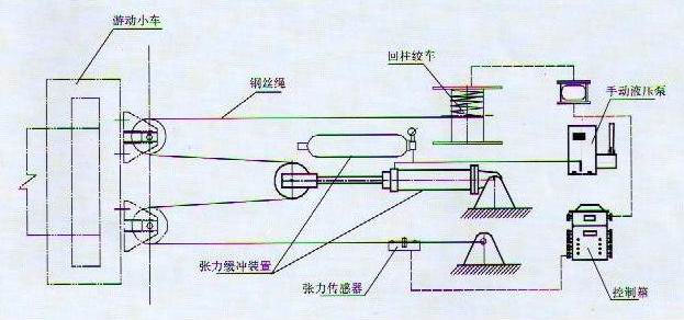 本裝置主要由基座、張緊絞車、液壓張力緩沖裝置、控制箱和張力傳感器五部分組成。圖示中的鋼絲繩由用戶提供,游動小車是皮帶機(jī)部件。張緊動作可根據(jù)需要實(shí)現(xiàn)變頻控制。 該型號張緊裝置結(jié)構(gòu)簡單、經(jīng)濟(jì)可靠、為免維護(hù)型張緊裝置。可用在采煤工作面。